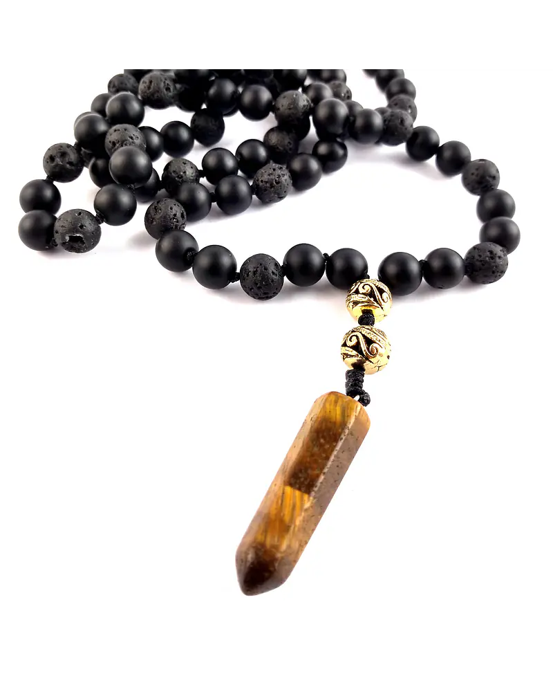 Fuerza volcánica con alma felina. Este collar combina lava volcánica para conexión con la tierra y energía ancestral, junto a turmalina negra para protección total. El protagonista: un colgante de Ojo de Tigre, piedra de visión y coraje. Todo montado con cuentas de 8 mm que le dan presencia, peso y carácter. No es un accesorio, es un amuleto que habla por ti.