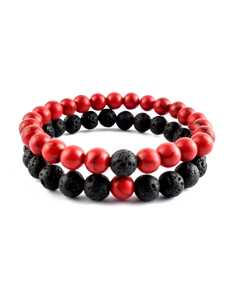 Un set para quienes se encienden mutuamente. La lava negra representa la raíz, la protección y la fuerza que no se quiebra. La howlita roja, teñida con intensidad, canaliza el fuego interno, la pasión y el impulso vital. Este par de pulseras es más que accesorio: es un vínculo energético que equilibra tierra y fuego.