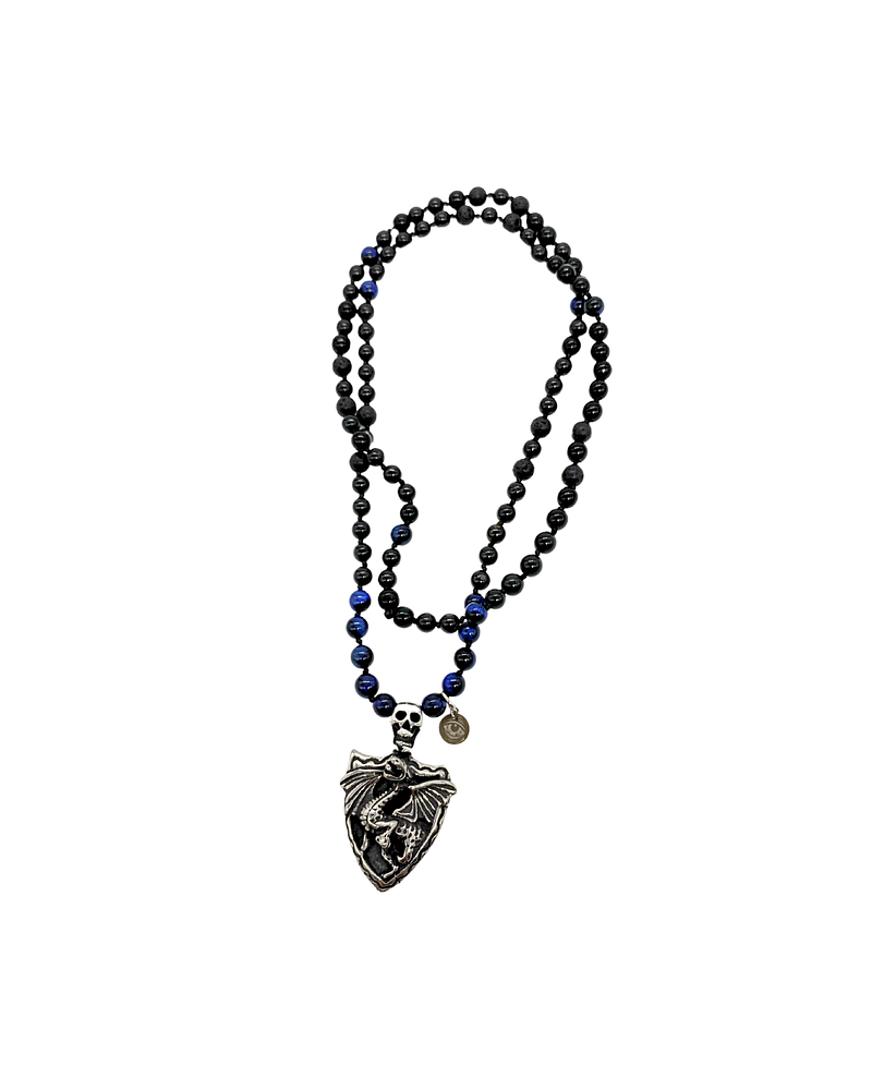 En el centro, un colgante con forma de escudo y dragón alado, coronado por una calavera. Un símbolo de guardianía mística y fuerza ancestral que protege lo sagrado, eleva la voluntad y enfrenta cualquier energía oscura que se cruce en tu camino.