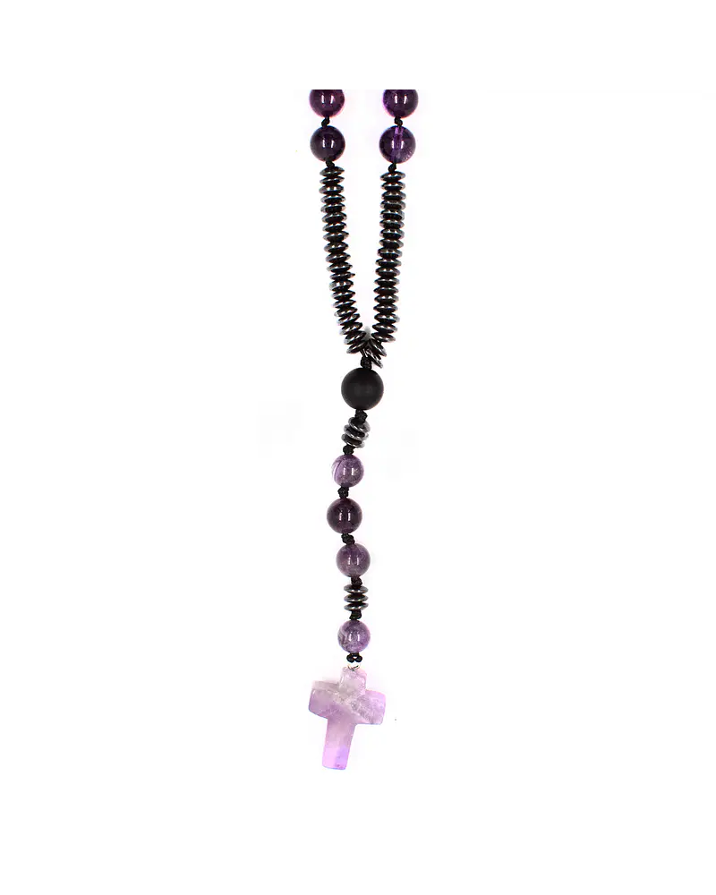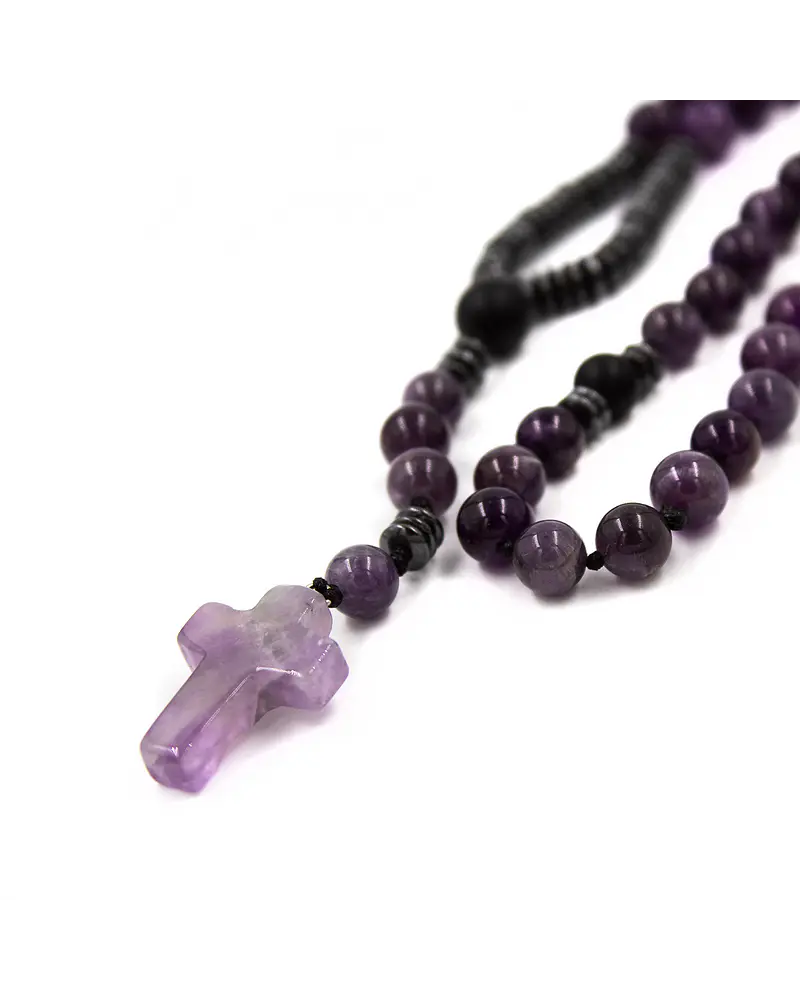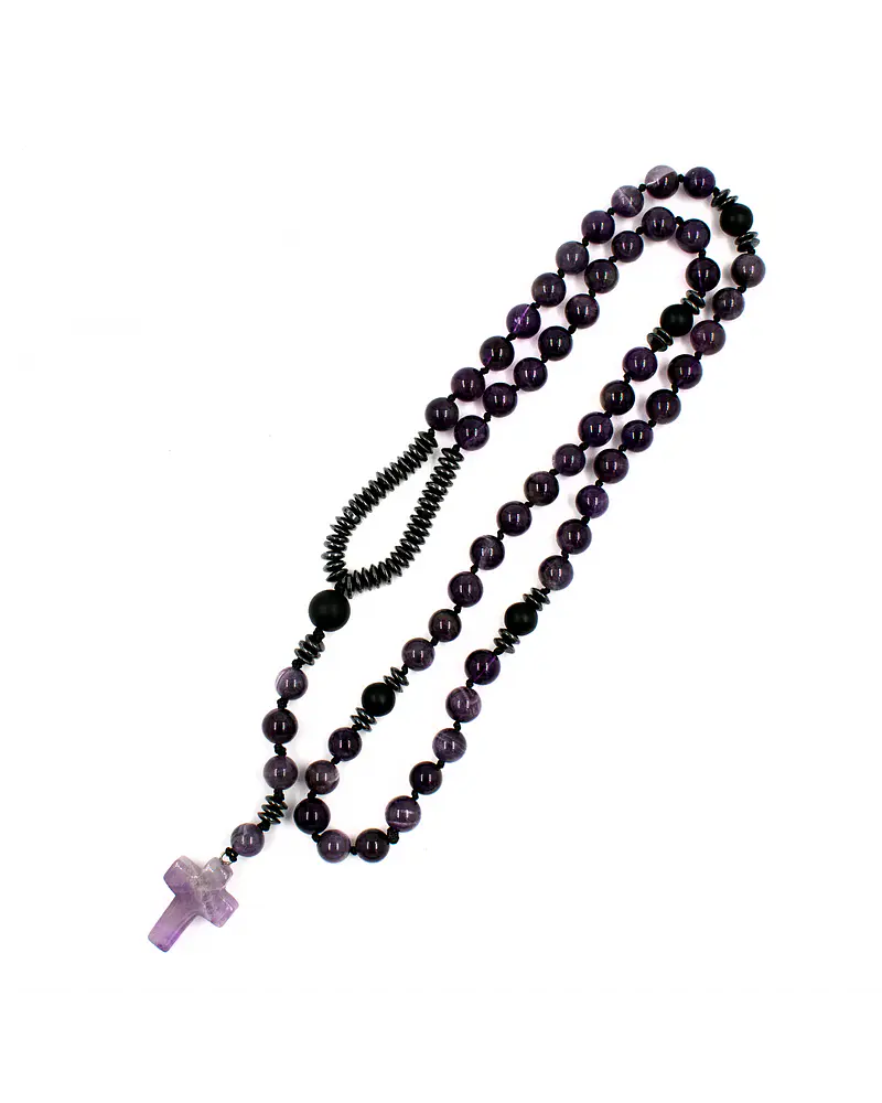 La cruz de amatista cierra esta pieza como símbolo de protección y conexión espiritual, transformando este rosario en un objeto de contemplación, meditación o protección energética personal.